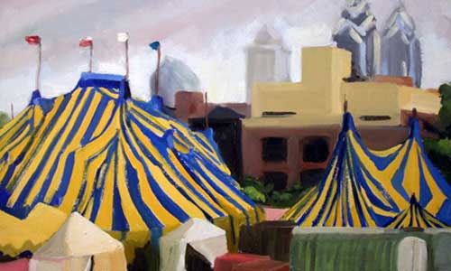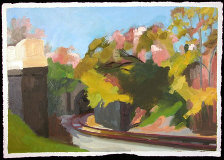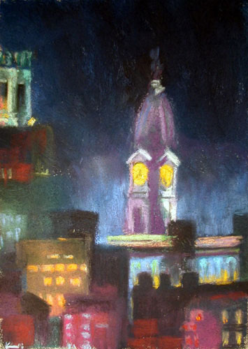 “Ed has become an accomplished painter, and as a teacher I enjoyed seeing how he approached his subjects. Recently Ed and I have been going out painting together as we share an interest in urban landscapes. Between us there is no longer the role of teacher and student but a new relationship of mutual mentorship. We are interested in the same types of subject matter and have a similar approach to painting. I have found it refreshing to work out of doors with another painter, to share a new fantastic color, talk about which views appeal to us and why, and borrow techniques from each other.” – Kate Kern Mundie