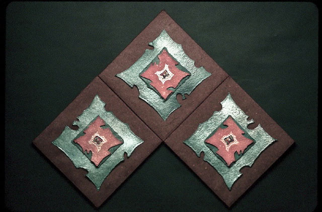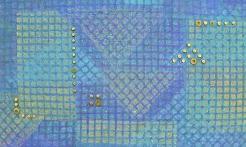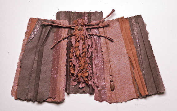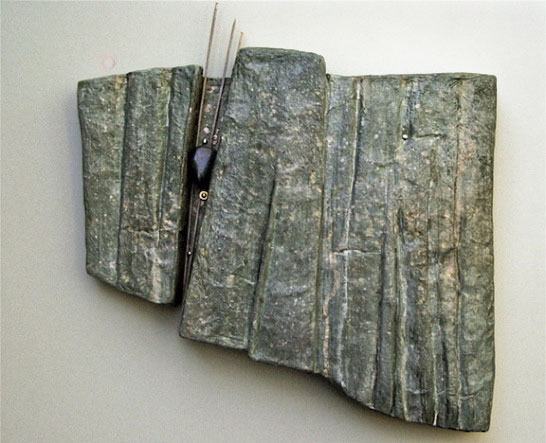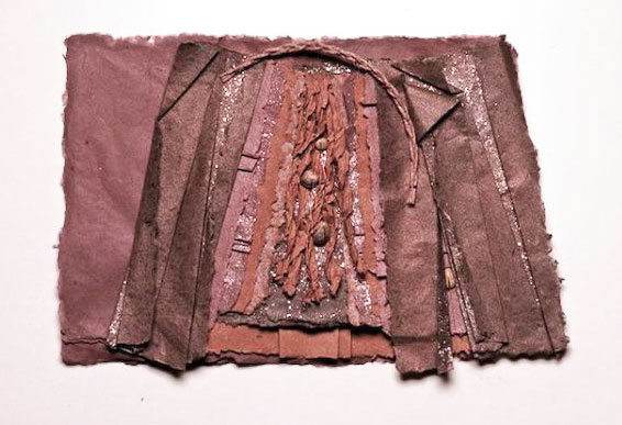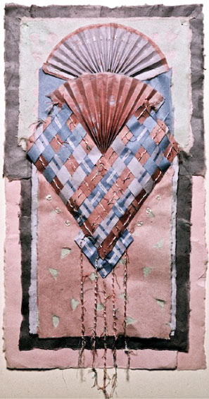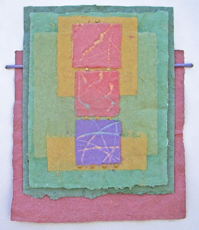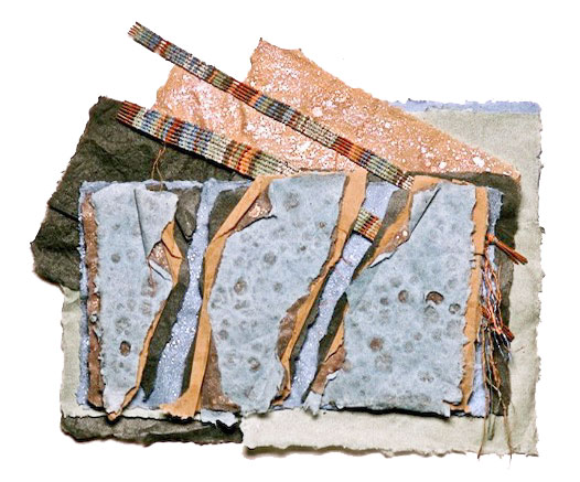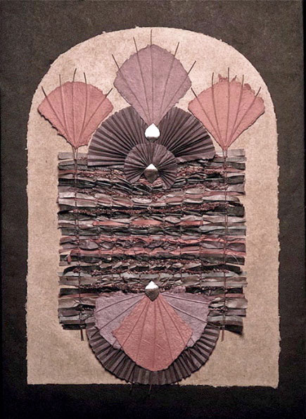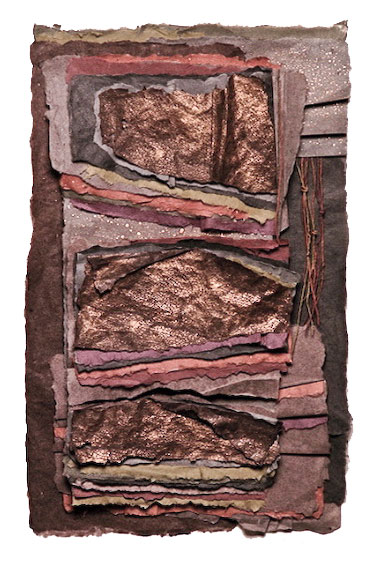 Joan Kopchik, a Bucks County papermaker and collage artist, creates contemporary mixed media wall pieces. The artist’s deep concern with image and surface are the source of her persuasive way of working. Ms. Kopchik’s articulate paste-ups and interwoven paper constructions stress the integration of layered surfaces and geometric images, often molding the paper surface towards expressive ends. Reeds and metal findings are applied to the burnished abstract surfaces of her pieces, which sometime resemble ancient stone.